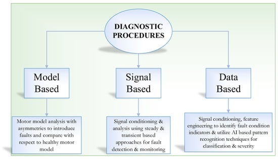 In this respect, there are three main families of diagnostic procedures, according to [17]. In all of these procedures, MCSA is employed at the initial step. The classification of these procedures on the basis of MCSA is given in Figure 1.