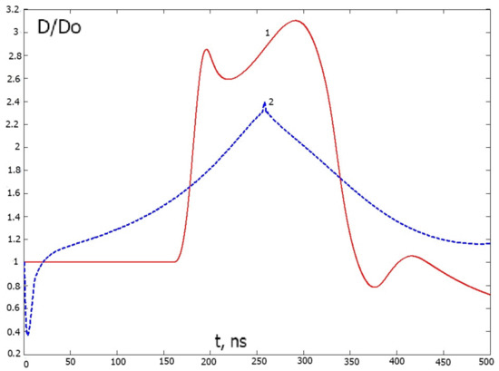 The temporary change in the discharge current is shown in Figure 2. The amplitude of the current pulse is ~90 kA; the front of the current rise is about 20 ns. The magnetic fields pressure of the magnetic field on the shell’s surface PB = 6 GPa.