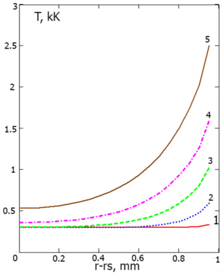 Radial temperature distributions in a copper cladding 1 mm thick at different times; t, ns: 1–5, 2–20, 3–50, 4–100, 5–200.
