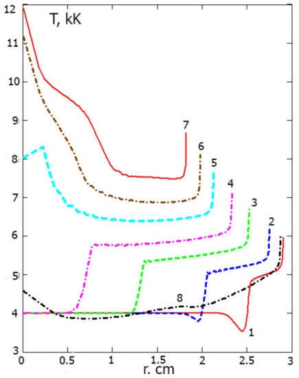 Temperature distributions of plasma compressed by a copper sheath; t, ns: 1–50, 2–80, 3–120, 4–150, 5–180, 6–200, 7–300, 8–360.