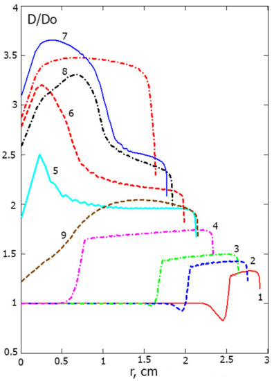 Density distributions of the plasma compressed by the shell at different times; t, ns: 1–50, 2–80, 3–100, 4–150, 5–180, 6–200, 7–220, 8–260, 9–290.