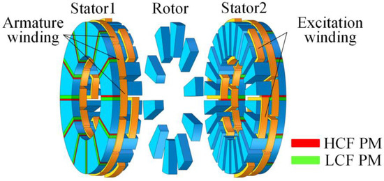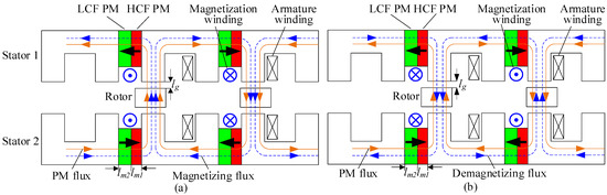 To improve the air-gap flux density, an additional HCF PM can be introduced into the PM memory machine to assist the LCF PM, resulting in a hybrid PM memory machine [8,9,10,11,12,13,14,15,16,17]. There are two basic configurations for hybrid PMs: the parallel-type PM (PPM) and the series-type PM (SPM). By arranging the HCF and LCF PMs in parallel, the hybrid PM memory machine can produce a controllable high air-gap magnetic flux, which can not only yield a wide speed range but also maintain the high-power density of PM machines. Although the PPM is the most common configuration that can offer a relatively high magnetic flux regulation capability, there exists a cross-coupling effect between the HCF and LCF PMs [8,9]. The magnetomotive force (MMF) of HCF PMs can lower the operating point of LCF PMs or, in the worst case, even demagnetize the LCF PMs due to their unbalanced MMFs, resulting in reduced flux regulation capability as well as air-gap flux density.