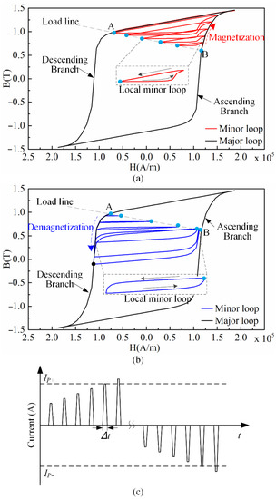 By combining Equations (6) and (7), the operating point trajectory of the LCF PM during the magnetizing and demagnetizing processes can be obtained, as shown in Figure 3a,b, respectively. The operating points stabilized at different locations on the load line in different magnetization states. When the LCF PM was completely magnetized, the operating point was located at point A on the descending branch of the major loop. As the magnetization of the LCF PM decreased, the stabilized operating point moved down along the load line towards the first quadrant and finally settled at point B on the ascending branch of the major loop. Although the operating point can be further decreased by the demagnetizing current, it will return to point B after the current is switched off due to the forward magnetization of the HCF PM. This forward magnetization effect will magnetize the LCF PM, making it hard for it to be further demagnetized. Thus, the operating point of the LCF PM under different magnetizations will be constrained within points A and B.