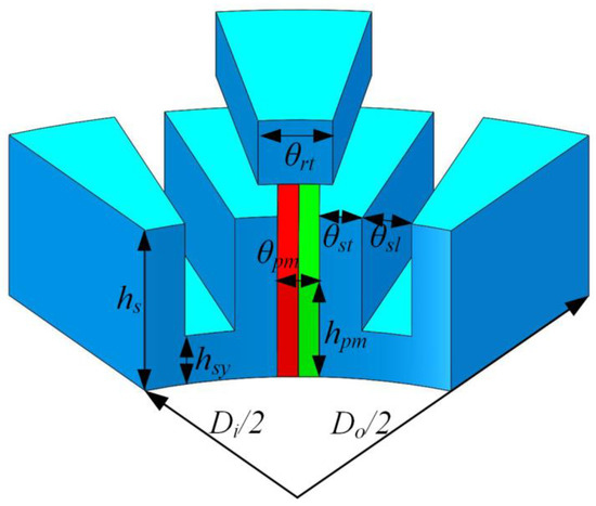 After the outer diameter of the machine is determined according to Equation (8), the turns of the winding can be calculated by the initial stator tooth angle and the stator slot angle and PM angle in the inner diameter, as shown in Figure 4, were set to 7.5 degrees. According to a previously designed and prototyped AFSM machine [24], the optimized rotor tooth angle is usually 1.6 times the stator tooth angle to obtain a sinusoidal back-EMF. The number of armature turns per phase can be roughly chosen on the basis of the assumed magnetic flux density and the given phase back-EMF, assuming the total flux produced by the SPM flows into the stator tooth and the stator yoke when the rotor pole is aligned with the stator pole. The flux density of the stator yoke can be calculated by