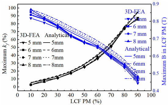 Figure 5 shows the effect of the thickness of the LCF PM on the and the operating point of the LCF PM obtained by the analytical method and 3D-FEA. As shown, the flux regulation capability increased with the increase in LCF PM thickness, while the magnetic flux density of the LCF PM decreased. This was mainly due to the relatively smaller coercive force of the LCF PM compared to that of the HCF PM. Thus, there is a tradeoff between the flux regulation capability and the magnetic flux density in SPM memory machines, where improving one factor will come at the expense of deteriorating the other. At a given LCF PM ratio, the magnetic flux density increases as the thickness of the SPM increases. In contrast, the flux regulation capacity remains almost constant even when the thickness of the SPM varies. Thus, the ratio of the LCF PM to the total thickness of the SPM is a key factor in the determination of the flux regulation capacity. However, a higher current is required to regulate the magnetization state of the LCF PM. In this paper, the LCF and HCF PMs were set to 4 and 2 mm, respectively, to gain a good balance between the flux regulation capability and the magnetic flux density.