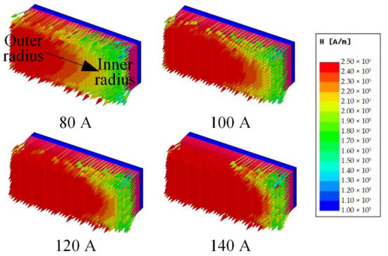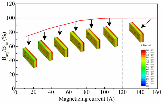In order to re-magnetize the LCF PMs to saturation, a magnetization field with sufficient amplitude is required. The corresponding current, which is determined by the magnetic flux distribution within the LCF PM during the magnetizing process, is denominated as the saturation current.