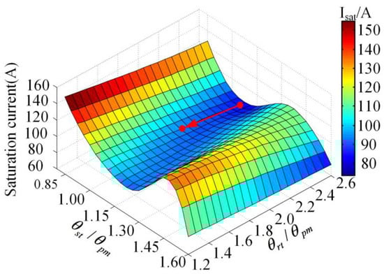 By fixing the total thickness of the SPM and the LCF PM ratio, the saturation current under different stator and rotor tooth angles was calculated, as shown in Figure 8. The stator tooth angle had a greater impact on the saturation current than the rotor tooth angle. The minimum saturation current was about 80 A when the stator tooth angle and the rotor tooth angle were 1 and 2.5 times that of the SPM, respectively. The rotor tooth angle was finally set to 1.8 times that of the SPM to achieve a sinusoidal back-EMF waveform. As a result, the minimum saturation current was slightly increased to about 100 A.