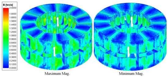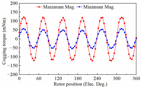 Figure 12 shows the cogging torque under two different magnetization states. The peak value of cogging torque decreased as the magnetization state decreased.