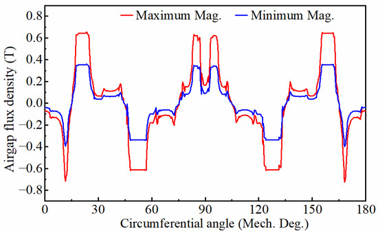 Air-gap flux density distribution at the average radius in the maximum and minimum magnetization states.