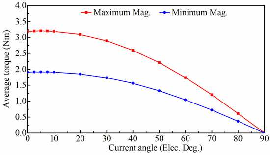 Average torque versus current angle in the maximum and minimum magnetization states.
