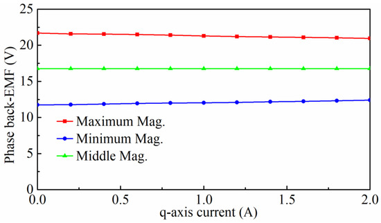 Figure 13 shows the average torque at the rated current due to the magnetization state variation as a function of the current angle. There was a slight electrical angle shift of the maxima, indicating that the reluctance torque made a very small contribution to the electromagnetic torque. This coincides with the traditional AFSPM machines. Therefore, Id = 0 control was utilized in different magnetization states. Figure 14 compares the electromagnetic torque waveform at the rated current at the maximum and minimum magnetization states. We found that the average torque and torque ripple decreased with a decrease in the magnetization state. Moreover, a q-axis current (Iq) up to two times the rated current was applied at different initial magnetization states. By measuring the phase back-EMF after removing the load current Iq, the load effect was obtained and is shown in Figure 15. The results showed that back-EMF remained almost constant when the load current Iq was less than the rated current. This indicates that LCF PMs can maintain their magnetization even at lower magnetization levels under a load current less than the rated current. However, it should be mentioned that the back-EMF will vary slightly after a higher load current.