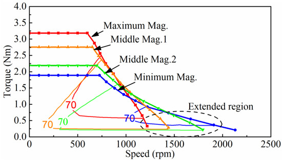 The torque-speed curves and efficiency maps of the proposed machine under different magnetization states were calculated and are shown in Figure 17 to verify the advantages of the adjustable PM flux. The proposed machine can be treated as a traditional axial flux-switching PM machine when the LCF PMs are fully magnetized. By controlling the magnetization of the LCF PM to realize flux weakening, the proposed SPM-AFSPM machine is able to operate over a wide speed range without the use of –Id current. Thus, the copper loss of the machine in the high-speed region can be significantly reduced; 70% efficiency contours for the machine under different magnetization states were also presented. As can be seen, the 70% efficiency contour did not overlap at different magnetization states and moved towards the high-speed region for lower magnetization states. Improved efficiency can be achieved in the high-speed region by selecting the most appropriate magnetization state for different operating conditions.