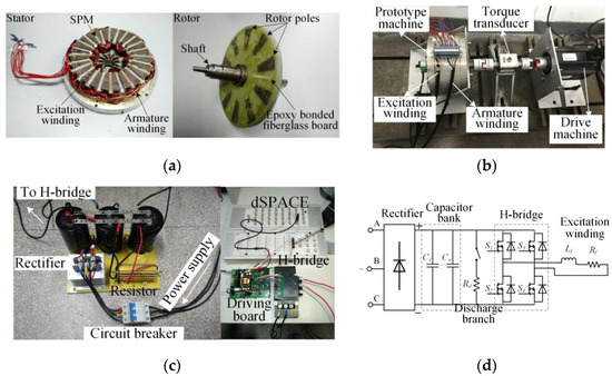 A prototype of the proposed machine was manufactured for experimental validation. Figure 18 shows the stator and rotor of the prototype and the experimental setup for testing the machine. An uncontrollable bidirectional capacitive-discharge magnetizer, as shown in Figure 18c, was used to magnetize and demagnetize the LCF PMs. Figure 18d shows the schematic of the magnetizer. As can be seen, the magnetizer was composed of a three-phase diode bridge rectifier, a capacitor bank, an H-bridge for changing the pulse current direction, and a discharge branch consisting of a resistor and a circuit breaker. The large capacitor bank was charged by an adjustable three-phase power supply. When it was charged to the required voltage, the H-bridge was turned on to apply a magnetizing or demagnetizing current to the excitation winding. The relationship between the capacitor voltage and the induced peak pulse current was experimentally obtained in advance to facilitate the application of the required voltage and pulse current that can coerce the LCF PMs into the desired magnetization states. Although precise control of the pulse current by the presented uncontrollable bidirectional capacitive-discharge magnetizer was difficult due to the variation of the circuit parameters, its accuracy was sufficient for testing the magnetization and demagnetization performance of the prototype machine.