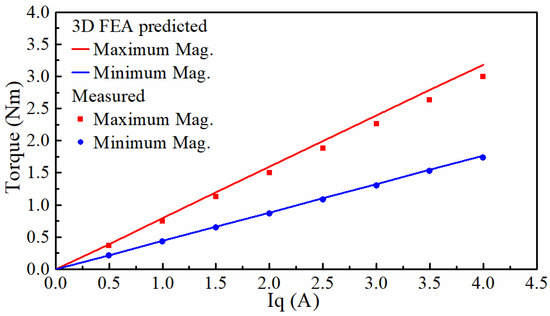 Average torque versus q-axis current in the maximum and minimum magnetization states.