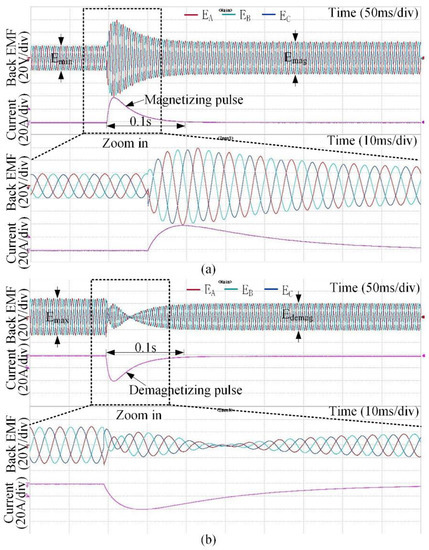 Measured transient response of back-EMFs under a short duration of current impulse at the rated speed: (a) magnetizing process; (b) demagnetizing process.