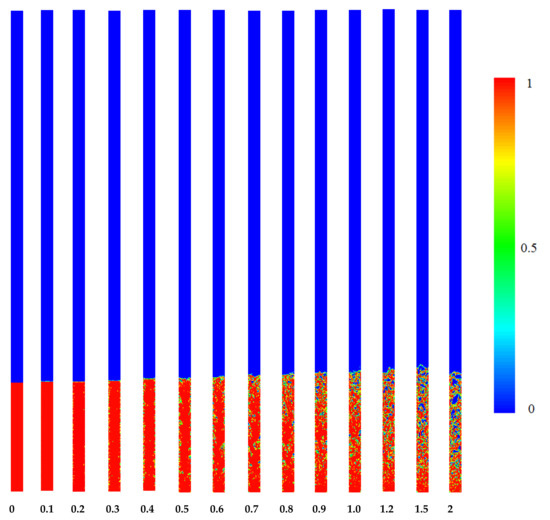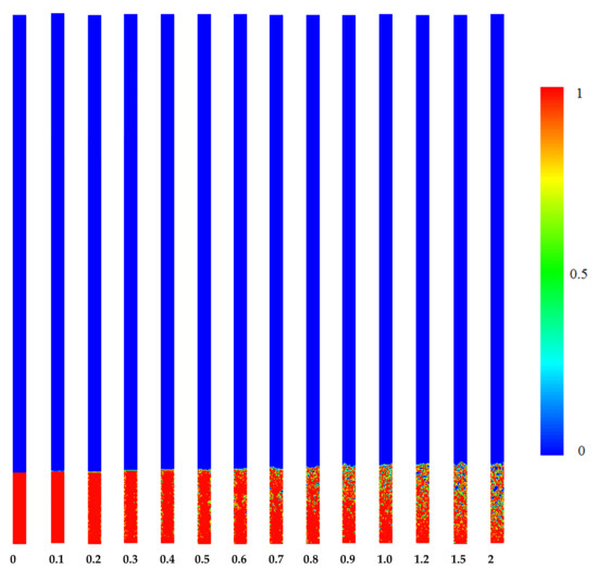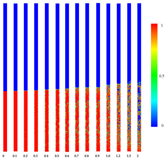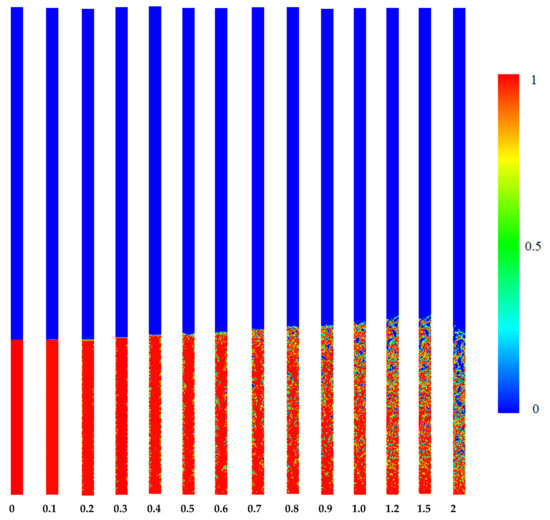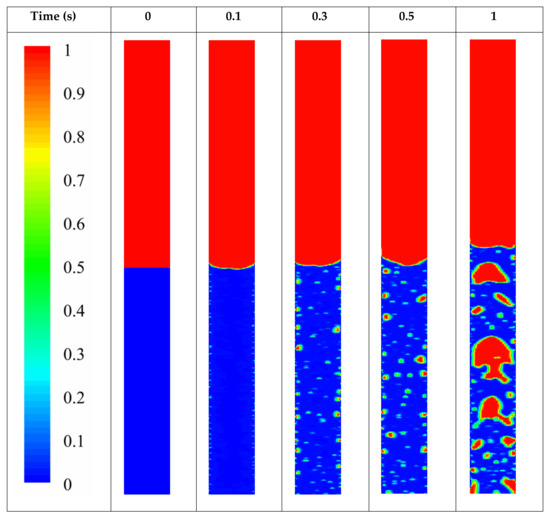 The volume fraction of the liquid and vapor phase for pool boiling in the evaporator section of the TPCT is depicted in Figure 2. The red and blue color is related to the vapor and liquid phase, respectively. The number one in the color map represents the pure vapor phase and the number zero represents the pure liquid phase. In the boundaries between the two phases, which is shown with green colors, there is a combination of liquid and vapor states. In a TPCT, heat is transferred through a phase change. The energy that is transferred from the TPCT wall in the evaporator section to the fluid inside the thermosyphon causes its phase to change. The liquid pool in the TPCT boils quickly due to the low pressure inside the thermosyphon, and this means that tiny bubbles are formed near the wall, which move upwards and can join with others and create more giant bubbles.