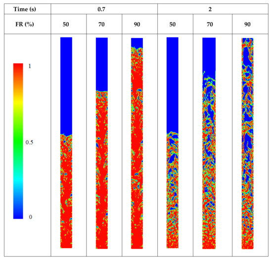 To obtain a better comparison between the formation and growth of bubbles in different filling ratios, the contour of the liquid volume fraction in the evaporator part, for two times of 0.7 and 2 s, are presented in Figure 8. Relatively tiny bubbles are observed for the filling ratio of 50%, while more and more giant bubbles are generated at higher filling ratios. When the FR is equal to 90%, the interconnectedness of the bubbles in the areas near the border of the adiabatic part can also confirm the higher thermal resistance of the TPCT at higher filling ratios.