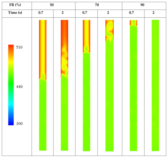 The temperature distribution for the studied filling ratio at 0.7 and 2 s in the evaporator section of the TPCT is illustrated in Figure 9. Through the vaporization of the liquid, the produced vapor moves upwards due to the buoyancy effect. At FR = 50% and time = 0.7 s, the movement of vapor in the form of a jet from the interface of the liquid and vapor towards the condenser section of the TPCT is noticeable and the differentiation of its temperature contours compared to its surrounding points is also evident in this figure. At time = 2 s, the movement of the vapor towards the condenser part is similar to turbulent flow. It covers a larger part of the cross-section, which shows that the vapor occupies a larger volume of the space above the liquid with the higher temperature.