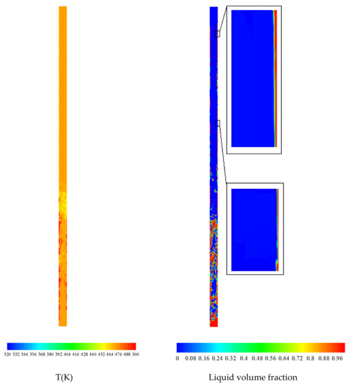 The liquid film formation is directly dependent on the cooling rate; in other words, the amount of heat taken from the TPCT in the condenser section. As mentioned in Table 1, a constant temperature of 298 K has been applied as a boundary condition on the pipe wall in the condenser section. In the upper part of the tube, no liquid film appears to have formed, or liquid droplets have formed but have not appeared as a film layer. It seems that by increasing the cooling rate in the condenser part of the system, the formation rate of the liquid film layer in the upper part of the TPCT can also be intensified. As it is not possible to create a full vacuum using conventional vacuum pumps in heat pipes, in the industrial applications of heat pipes, some non-condensable gases, such as air, always remain in the upper part of the system, which can affect the liquid film generation in that part as well.
