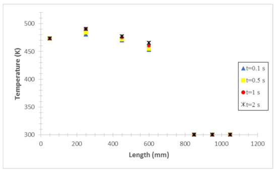 The wall temperature distribution along the thermosyphon at 0.1, 0.5, 1 and 2 s after the start of the process for a filling ratio of 30% is illustrated in Figure 12. It is evident that the temperature of the thermosyphon decreases from the evaporator to the condenser. The thermal resistance of the thermosyphon for the time of 0.1, 0.5, 1 and 2 s is obtained to be 0.59, 0.59, 0.58 and 0.58, respectively.