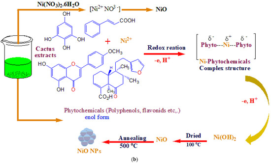 Green synthesis of NiO nanoparticles was achieved through three chemical reactions with the solvated Ni2+ ions and phytochemicals from the cactus pear. These pears are rich in phytochemicals such as ascorbic acid, phenolic acid, and flavonoids [33].