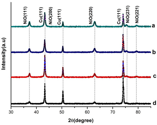 The appearance of four diffraction peaks at 43.2 ° ,   50.4 ° ,   74.1 ° ,   and   89.9 ° indexed to the (111), (200), (220), and (311) planes, belongs to the face-centered cubic (FCC) originating from the Cu substrate (JCPDS card no. 00-004-0836) [21]. At a diffraction angle of 2 θ     43.2 ° , peaks from the NiO (200) film and Cu (111) substrate overlap, making it difficult to draw a conclusion on whether the peak intensity is increasing or decreasing with RS in this particular phase.