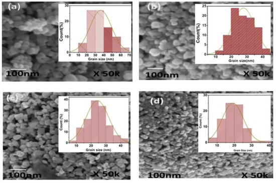 Scanning electron microscopy (SEM) was employed to inspect the surface morphology of the prepared NiO samples. Figure 3a–d represent the SEM images of the green synthesized NiO thin films deposited on a copper substrate at different RS: (a) 700, (b) 900, (c) 1100, and (d) 1300 RPM. From the images, one can observe that all the prepared samples have a homogeneous and spherical-like morphology, with narrow grain boundaries, in which the rotational speed substantially impacts the size and distribution. NiO surface structures deposited at 700 and 900 RPM are densely covered and compacted when compared to thin films deposited at 1100 and 1300 RPM, demonstrating that their thickness decreases as the RS increases.