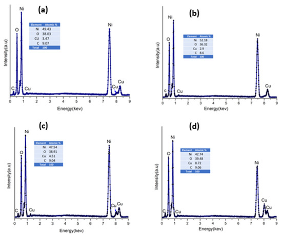 The elemental compositions of the green synthesized NiO thin films were investigated using energy-dispersive X-ray spectroscopy (EDS). The EDS spectrum shown in Figure 4a–d confirms the presence of Ni and O in the prepared samples. The elemental composition of the thin film depends on the RS of the substrate. As we increase the RS from 700 to 1300 RPM, the concentration of Ni and O species decreases, causing the copper composition to increase. This is due to the fact that as the RS increases, the film thickness decreases, allowing electrons to easily penetrate and interact with the atoms of the thin film’s surface and interface on the given substrate. This results in the emergence of various signals containing information about the copper substrate [39]. The weak peaks of carbon emanated from a tape used during measurement.
