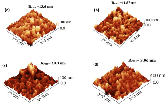 To further investigate the surface topography of the green synthesized NiO thin films, a surface roughness analysis was carried out using AFM. Figure 5 shows a 3D AFM micrograph of the green synthesized NiO at (a) 700 RPM, (b) 900 RPM, (c) 1100 RPM, and (d) at 1300 RPM on a Cu substrate. The figure depicts the formation of a nanopillar-like pattern in all the green synthesized NiO thin films as the RS changes the roughness value. The rms decreased from 13.6 to 9.06 nm as the RS was raised from 700 to 1300 RPM. The NiO films prepared at RS of 700 RPM exhibited relatively higher surface roughness, which could allow more light to be trapped due to multiple reflections within the film and thus enhanced the solar absorption. Moreover, the interface’s roughness raises the index of refraction and lowers the surface reflection, which allows more light into the active selective absorber layer.