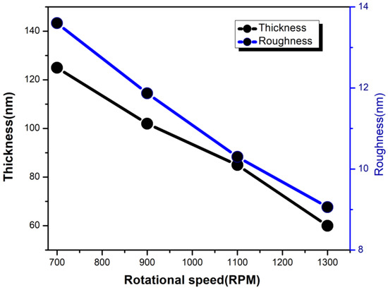 The thickness of the green synthesized NiO nanocoatings was measured by a Bruker Dektak XT profilometer. The measured thickness of the films deposited at 700 RPM is 125 nm; it drops sharply to 102, 85, and 60 nm as the RS ramps up to 900, 1100, and 1300 RPM, respectively, indicating an inverse relationship between the thickness and rotational speed. Figure 6 shows the effect of RS on the thickness and surface roughness of the green synthesized NiO films. The decrease in film thickness and surface roughness with increasing RS values is consistent with the mathematical relation stating the inverse relation of thin film thickness with the square root of the angular velocity: t 1 ω [40].