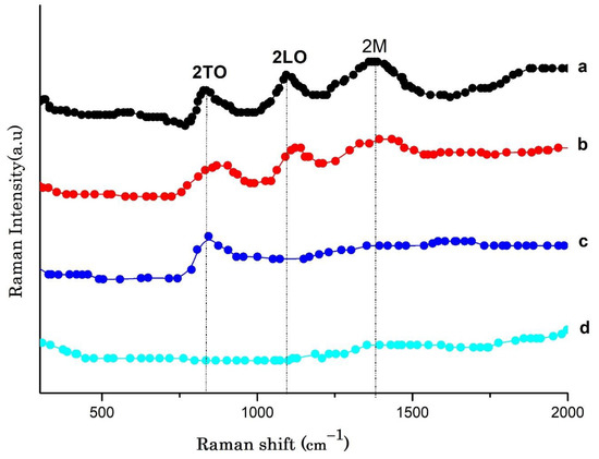 To further identify the chemical structure of the green synthesized NiO nanocoatings, Raman spectroscopy measurements were recorded in the range of 400–2000 cm−1. Figure 8 depicts room-temperature Raman spectra of the green synthesized NiO thin films prepared at RS of (a) 700 RPM, (b) 900 RPM, (c) 1100 RPM, and (d) 1300 RPM using 532 nm excitation. It is evident that the green synthesized NiO films prepared at RS of 700 RPM exhibit three Raman active peaks at ~830 cm−1, ~1095 cm−1, and ~1372 cm−1, corresponding to two phonon (2P) transverse optical (2TO), two phonon (2P) longitudinal optical (2LO), and two-magnon (2M) bands related to the Ni2+-O2−-Ni2+ super-exchange interaction of the NiO films, respectively [45,46].