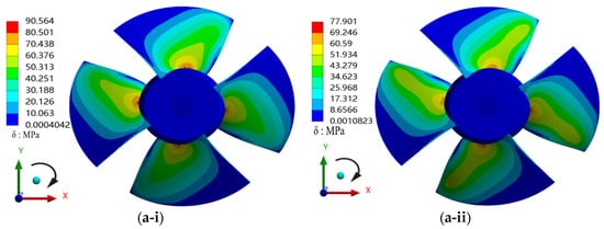 Figure 7a,b show the dynamic stress distribution on the blade surface under the pump and turbine conditions, respectively. This paper lists the dynamic stress distributions of the blade under different flow rates at the same time after the coupling calculation was stable. In Figure 7(a-i–a-iv), we show the cloud diagrams of the dynamic stress distribution from low-flow conditions to high-flow conditions, respectively. It can be seen from the figure that with the increase in the flow rate, the dynamic stress on the blade surface decreases. Specifically, the maximum dynamic stress at the root of the blade decreases, but the position of the dynamic stress does not change, and it is located at the root of the blade; the dynamic stress distribution on the blade surface does not change, indicating that the change in the flow rate only changes the dynamic stress on the blade surface without changing the stress distribution.