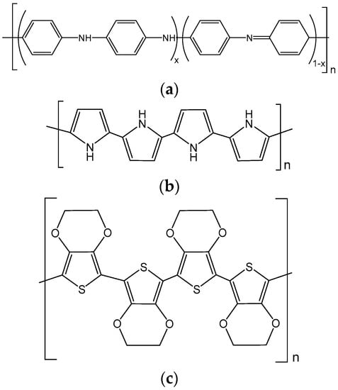 Structures of the most important conducting polymers. (a) Polyaniline; (b) Polypyrrole; (c) Poly-3,4-ethylendioxythiophene.