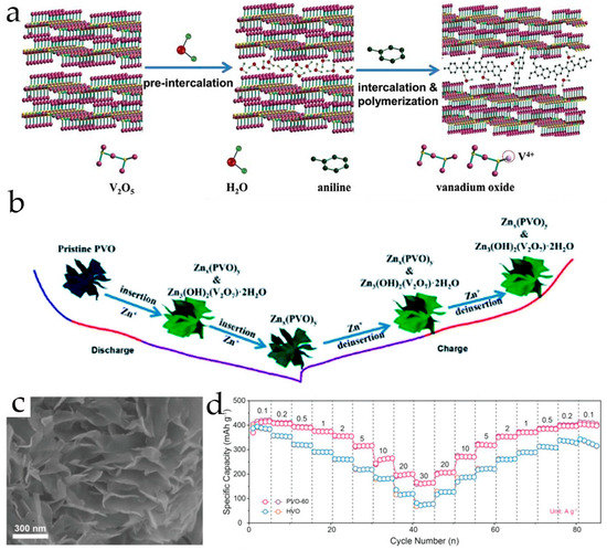 Polyaniline intercalation strategy was proposed for the first time in [53]. PANI-intercalated vanadium oxide (PVO) was obtained by one-step in situ oxidative polymerization with intercalation of aniline into vanadium oxide according to an earlier procedure (Figure 2a) [59]. During the oxidative polymerization of aniline, V5+ was partially reduced to V4+ while polyaniline was formed between the layers of vanadium oxide. According to TGA analysis, the content of PANI in the PVO composite was 10.8 wt. %. According to the XPS data, the atomic ratios of V4+ and V5+ were 31.68% and 68.32%, respectively. After polyaniline and water co-intercalation, the interlayer spacing was expanded from 5.77 Å of V2O5 to 14.02 Å in PVO, facilitating the ion diffusion. The partial reduction of V5+ to V4+ in the lattice and π-conjugated network of PANI enhanced the charge transport properties of the PVO. The AZIB utilizing the obtained PVO cathode delivered high specific discharge capacity (420.4 mAh·g−1 at 0.5 A·g−1), a prominent rate capability (400 mAh·g−1 at 5 A·g−1 and 288.9 mAh·g−1 at 20.0 A·g−1) and high capacity retention (87.5% after 600 cycles at 5·A g−1), although the gradual increase of the specific capacity during about 20 cycles points at the slow activation of the cathode material. A combined intercalation and conversion reaction mechanism of Zn2+ ion storage in the PVO was confirmed by ex situ XRD and ex situ high-resolution XPS spectroscopy. During the discharge process, an electrochemically active intermediate phase (Zn3(OH)2(V2O7)·2H2O) was formed upon Zn2+ intercalation into PVO, and upon further discharging this phase evolved into Znx(PVO)y. At the fully charged state Znx(PVO)y and Zn3(OH)2(V2O7)·2H2O coexisted (Figure 2b).