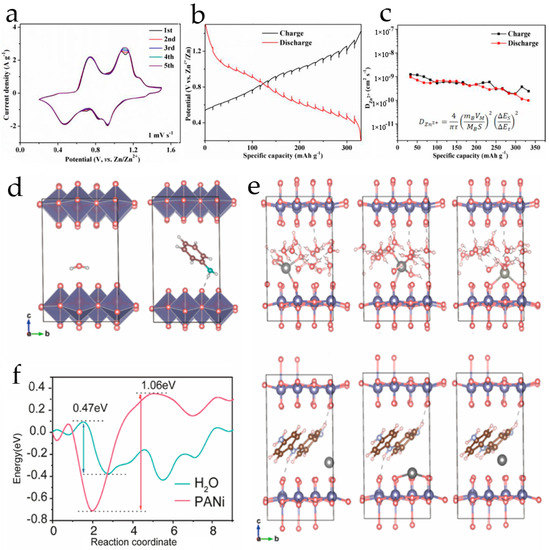 (a) CV curves of PANI/V2O5 composite in the first five cycles at 1 mV·s−1 [54]; (b) The GITT curves and (c) the calculated diffusion coefficient of Zn2+ of PANI/V2O5 composite [54]; (d) Models for calculating binding energies of water- and aniline-intercalated V2O5 matrix [63]; (e) possible Zn ion migration pathway in VHO and PAVO. Blue, red, and grey balls represent V, O, and Zn atoms, respectively [63]; (f) energy barriers along Zn migration pathways for VHO and PAVO [63].