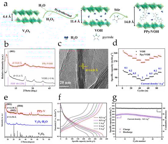 (a) Scheme of the PPy/VOH composite synthesis [85]; (b) XRD patterns of VOH and PPy/VOH [85]; (c) HRTEM image of PPy/VOH [85]; (d) Rate capability of VOH and PPy/VOH at current densities 0.1–2 A·g−1 [85]; (e) XRD patterns of PPy-V, V2O5·H2O and V2O5 for comparison [86]; (f) Charge–discharge curves of PPy-V-10 electrode at current densities 0.2–5 A·g−1 [86]; (g) Cycling performance of PPy-V-10 electrode (50 cycles at 0.2 A g−1) [86].