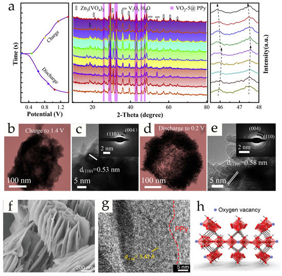 (a) Ex situ XRD patterns of VO2-5@PPy electrode at various charge/discharge states [16]; (b,c) TEM and HRTEM images of VO2-5@PPy charging at 1.4 V [16]; (d,e) TEM and HRTEM images of VO2-5@PPy discharging at 0.2 V [16]; (f) FESEM image of Od−HVO@PPy nanosheets [68]; (g) HRTEM image of Od−HVO@PPy [68]; (h) Crystal structure of the Od−VO2·xH2O [68].