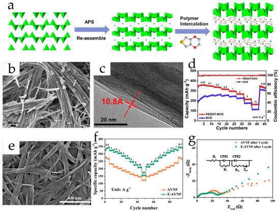 (a) Scheme of structural changes during the preparation of PEDOT-NVO [87]; (b) SEM of PEDOT-NVO [87]; (c) HRTEM of PEDOT-NVO [87]; (d) Rate capability of NVO and PEDOT-NVO at different current densities [87]; (e) SEM image of E-AVNF [58]; (f) Nyquist plots of AVNF and E-AVNF after 1st cycle [58]; (g) Specific capacities of AVNF and E-AVNF electrodes at different current densities [58].