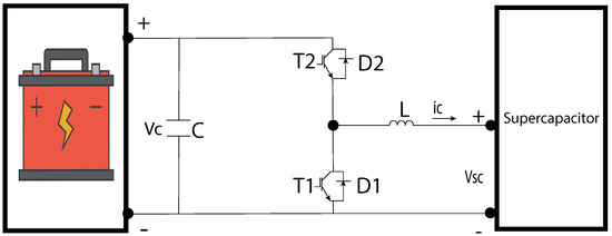 - Buck operation: In this mode, the output voltage is decreased regarding the input voltage. To achieve this, T1 is off and T2 is activated, then, the energy is transferred from the capacitor () to the supercapacitor voltage (). At the moment T2 is turned on, current flows from the capacitor C, generating current to the supercapacitor. As a result, a fraction of this energy is charged into inductance L. On the other hand, when T2 is turned off, the current charged in L is discharged into through diode D1, driving the current in the direction of capacitor C [14].
