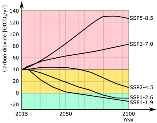 Different scenarios have been proposed for the possible future development of anthropogenic drivers of climate change [], with the evolution of anthropogenic carbon dioxide depicted in Figure 2 for different shared socioeconomic pathways (SSPs). The most optimistic scenario, SSP1-1.9, reflects a world with net zero CO2 emissions reached around 2050, which avoids the worst impacts of climate change and has temperatures around 1.4 °C higher than in preindustrial times. In order to achieve this scenario, inclusive development and environmental boundaries must be considered. The management of world resources should be considered as well increases in education and health investment, reduced inequality within and between countries, and lower energy and resources use intensity []. In contrast, the SSP3-7.0 and SSP5-8.5 scenarios show an increase in CO2 emissions due to competitiveness between countries, and temperatures reaching 3.6 and 4.4 °C higher as a consequence of the prevalence of fossil fuels in a world oriented towards quick technological processes and the development of human and social capital investments, with energy-intensive and resource-consuming lifestyles. Due to the close relationship between the fuel used for electricity generation and greenhouse emissions, as more efficient thermodynamic cycles are developed and renewable energy sources are used in the hot source to power them, SSPs will evolve to have less emissions.