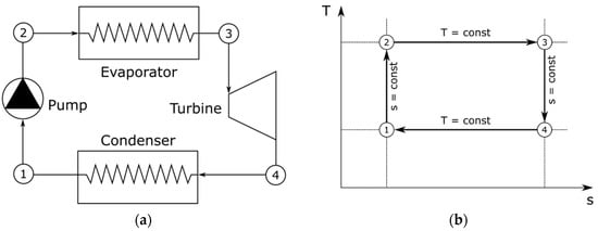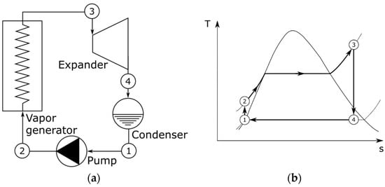 Figure 18 shows the main components and the T-s diagram of an ideal ORC. The organic fluid is compressed (1–2) and then is evaporated (2–3) in a heat recovery vapor generator (HRVG), which takes heat from an external source. The expander is fed with this superheated vapor, producing useful power and reducing the pressure of the vapor (3–4). The vapor finally passes through a condenser, closing the thermodynamic cycle (4–1). A review of modeling approaches and tools for the simulation of ORCs may be found in [].