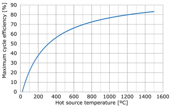 Figure 4 shows the evolution of this maximum efficiency as a function of the hot source temperature when the cold sink has been fixed at 20 °C. Although the Carnot cycle is a theoretical cycle and the reversible thermodynamic processes proposed are impossible to be followed in an actual cycle, it sets the maximum theoretical limit for the efficiency of the rest of power generation cycles. The so-called Carnot factor defines the ratio between the efficiency of a particular cycle and this maximum possible efficiency: