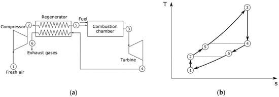 Exhaust gases from the turbine are at a relatively high temperature. If they are released into the atmosphere, this energy will be lost. The regenerative Brayton cycle includes a heat exchanger called a regenerator that uses the residual heat from the exhaust gases (4–6) to preheat the compressed air after the compression process (2–5), as shown in Figure 7.