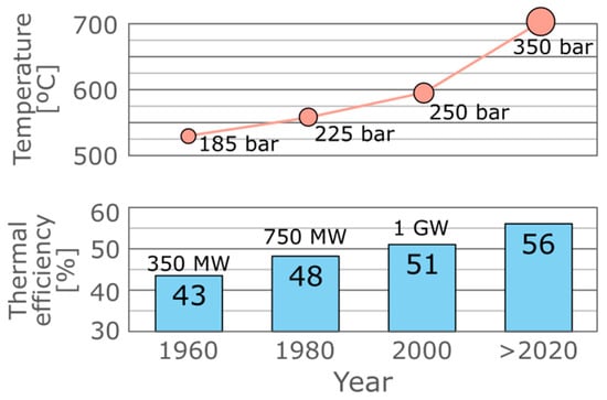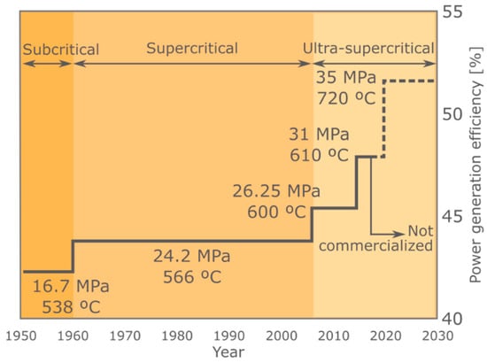 Rankine cycles were originally conceived as liquid water—steam cycles, but their definition may be currently associated with any thermodynamic cycle using a substance that undergoes phase changes for transferring heat in order to obtain power. Rankine cycles for electricity generation using coal as fuel were started in the 1920s. Then, Europe started supercritical Rankine cycles (working above the critical point of water) in the 1930s, which reached the USA in the 1960s []. Environmental demands improved the technology with the installation of forced circulation boilers, equipped with scrubbers for the desulfurization of the flue gas and selective catalytic reactors for reducing NOx. Figure 11 shows the evolution of the technical parameters of steam power plant turbines since 1960 [], where it may be observed how the efficiency of the cycles is still increasing, mainly as a consequence of the use of materials that withstand higher pressures and temperatures. A similar evolution has been found in coal-fired power units in China [], as depicted in Figure 12, which shows the thermal efficiency from subcritical to super- and ultra-supercritical power plants alongside the maximum pressure and temperature values reached in the cycle.