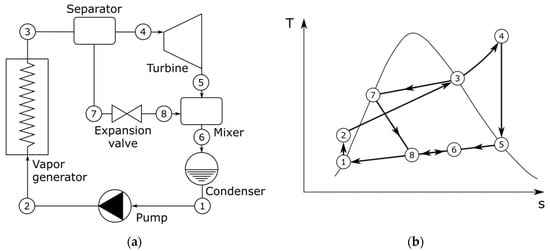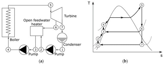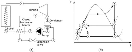 Figure 15 shows the flowchart of the cycle and the T-s diagram of the regenerative Rankine cycle with an open feedwater heater. This heater preheats the feedwater (2–3) using the turbine bleeding at (6). The regenerative Rankine cycle with a closed feedwater heater is shown in Figure 16. In this case, the heater preheats the feedwater (2–3) using the turbine bleeding at (5). The remaining outlet of the closed heater must be expanded (7–8) and is then reinjected into the cycle at a lower pressure (8).