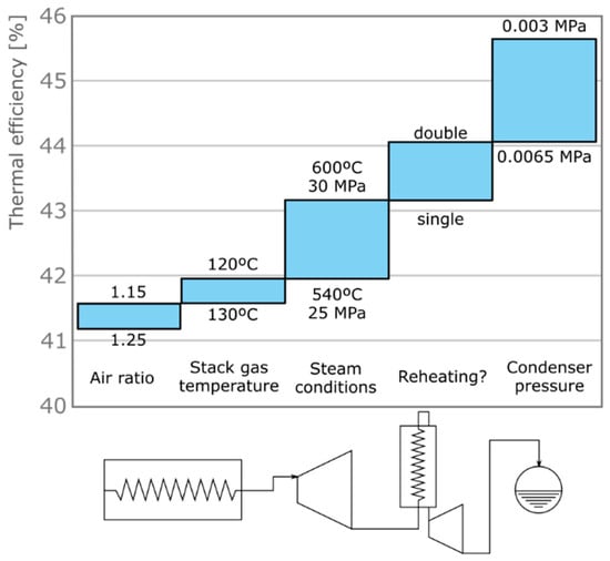 With just modifications of the original Rankine cycle such as reheating and regeneration combinations, higher cycle efficiency values, lower fuel consumption values and a reduction in operational costs and carbon emissions may be reached. Meana-Fernández et al. [] studied possible modifications of a propulsion plant on a Liquefied Natural Gas (LNG) ship that would increase its efficiency by up to almost 34%, reducing fuel consumption to around 20 ton/day and avoiding the emission of more than 20,000 ton of CO2 per year. Beér et al. [] quantified the impact of operating conditions and cycle modifications to increase the efficiency of a Rankine cycle power plant up to 45% and beyond: reducing the air ratio and the stack gas temperature to decrease waste gas heat losses, increasing the temperature and pressure of the steam from 25 MPa and 540 °C to 30 MPa and 600 °C, adding a double reheating instead of using a simple one, and decreasing condensing pressure from 6.5 to 3 KPa, as shown in Figure 17. Additionally, coal-firing power plants are the slowest in relation to other fossil fuel plants and have the highest emissions. In this context, Znad et al. [] introduced a control strategy to speed up the startup process of a coal power station, resulting in savings in fuel and water while keeping the starting time as low as possible and retaining high efficiency and safe operation.