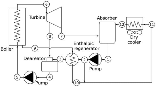 The hygroscopic cycle developed by Rubio-Serrano [] introduces hygroscopic salts into a Rankine cycle. The equipment diagram is shown in Figure 20. A condensation process occurs in a steam absorber instead of in a condenser, with the steam being cooled by its absorption by hygroscopic compounds (7–12–1). The hygroscopic salts mixed with the water are desorbed and purged from the boiler (9), so clean steam may flow to power the cycle turbine (6–7). The boiler blowdown stream is used to preheat the feedwater (2–3), resulting in an increase in the efficiency of the cycle. It must be noted that the elimination of the condenser avoids the use of cooling water, allowing the possibility of implementing this cycle in regions with low or no access to water. Additionally, the heat may be released with dry air coolers (11–12) to higher-temperature surroundings as with traditional Rankine cycles []. This allows condensing temperatures to rise over 13 °C for the same condensing pressure as in a Rankine cycle. The boiler works similarly to that of a Rankine cycle, so any type of fuel (fossil, nuclear or renewable) may be used.