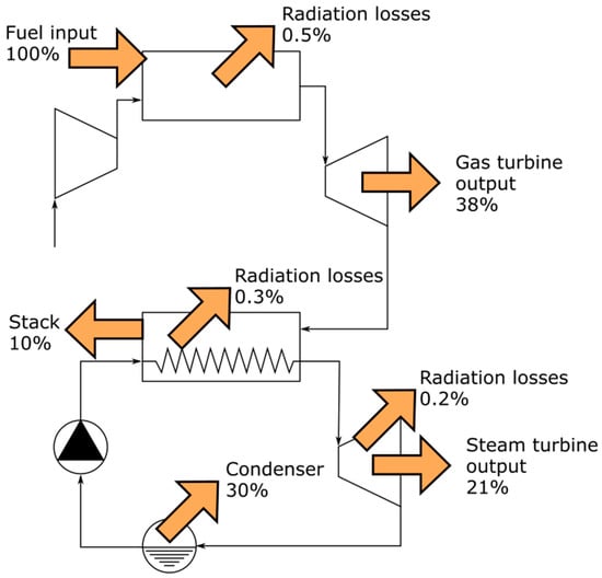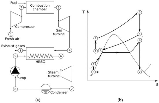 Power cycles based on gas turbines combine the combustion chamber, compressor and turbine in the same device, simplifying its structure. Additionally, the investment cost per MW is lower than for other cycle types [,,]. Thermal efficiency may exceed 30%.