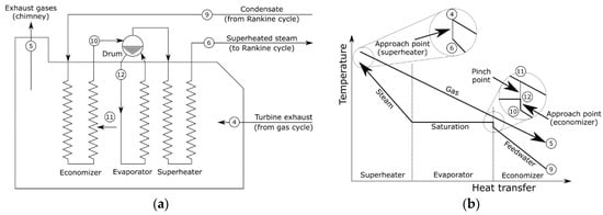 The original Rankine cycle, as shown in Figure 13, is composed of a boiler, a steam turbine, a condenser, and a pump that recirculates water back into the boiler. The liquid that comes out of the condenser is compressed by the pump (1–2) and flows into the boiler. In the boiler, the liquid is heated up at constant pressure (2–3) until it reaches saturation conditions in the economizer. Then, it changes to steam in the evaporator and finally it is heated up until turbine inlet conditions in the superheater. After leaving the boiler, the steam is expanded in a turbine producing useful power (3–4). Finally, the steam leaving the turbine is condensed in a condenser (4–1) so that the cycle can start again [].