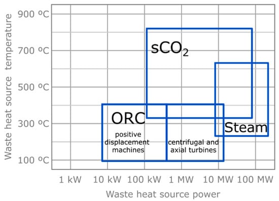 ORCs have the capability to work with low-grade thermal sources, such as low-enthalpy geothermal energy or solar energy, enabling the possibility of increasing the sustainability of power production cycles []. A comparison of waste heat recovery systems, with a focus on ORCs may be found in [], and a review of cycles and fluids for low-grade heat recovery is available in []. Waste heat may be used just for electricity production, or to provide hot water and space heating as well. Yazawa [] achieved electricity generation at 12% efficiency on the MW scale at around USD 4/W with a payback period below one year and a half.